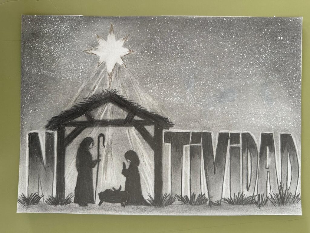 Gabriel desarrolló un dibujo con gran originalidad, utilizando la técnica de degradación de grises, en el que transformó la estructura en la que se encuentra La Natividad en la letra A para formar dicha palabra.