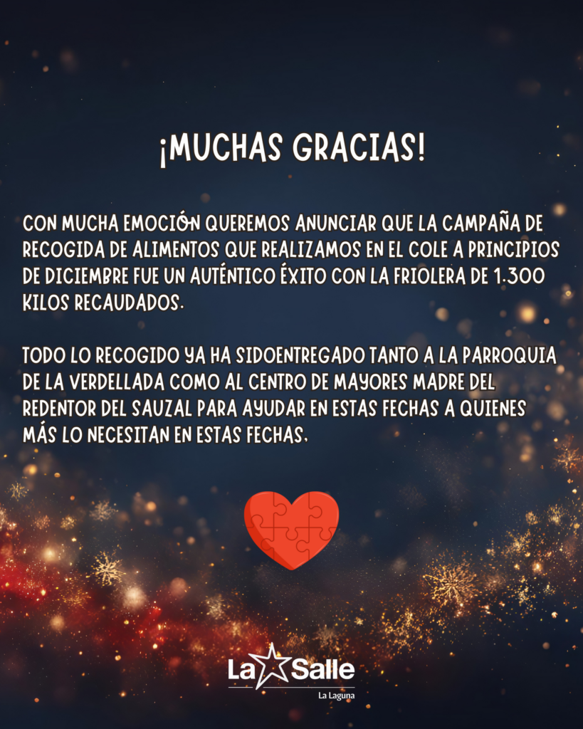 Con mucha emoción queremos anunciar que la campaña de recogida de alimentos que realizamos en el cole a principios de diciembre fue un auténtico éxito con la friolera de 1.300 Kilos recaudados.