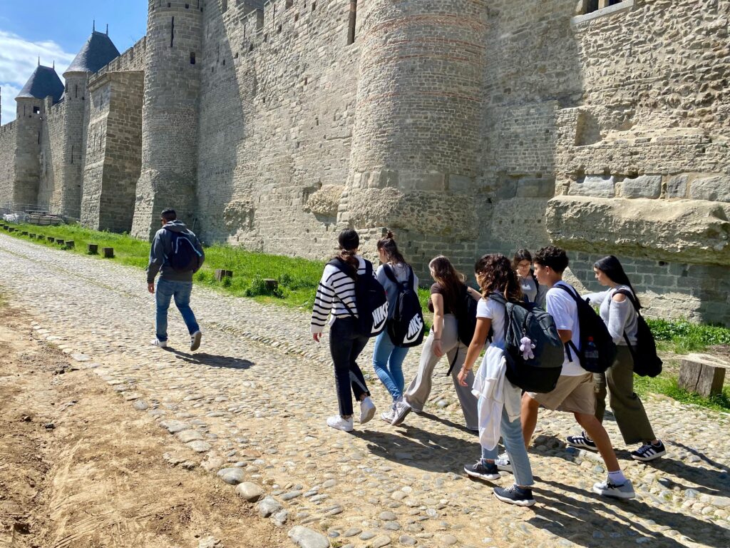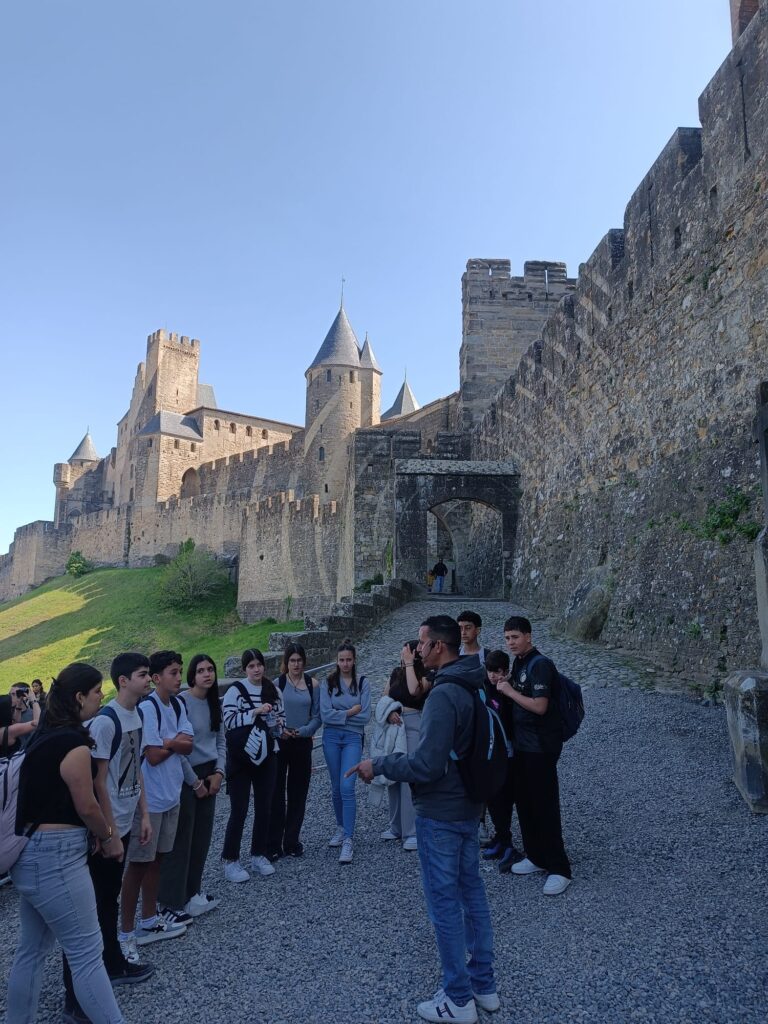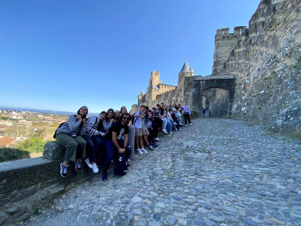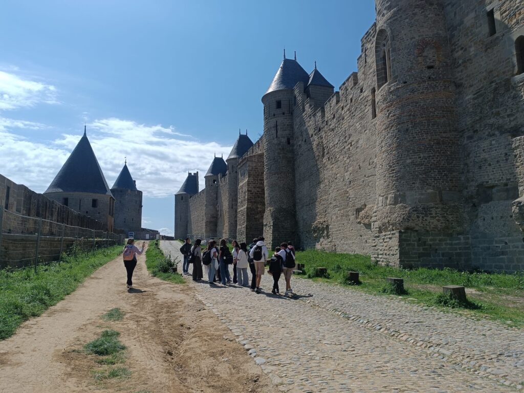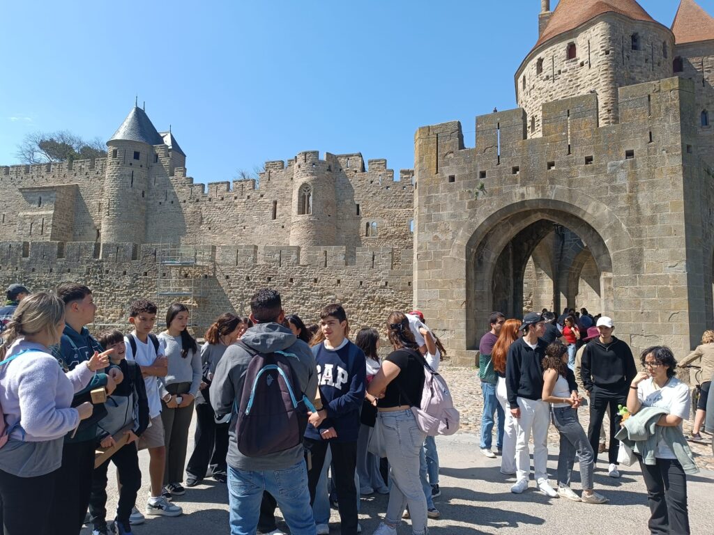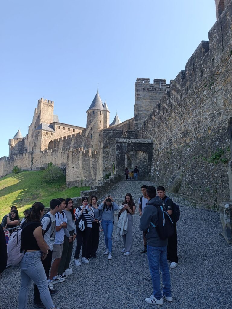 Hoy tocaba madrugar un poquito para pasar el día en la maravillosa ciudad fortificada de Carcassonne, patrimonio mundial de la humanidad por la UNESCO desde 1997 y una visita obligatoria dentro de nuestro itinerario. Cogimos la guagua dirección a la ciudad francesa , una vez allí nuestro guía nos explicó algunas curiosidades de lugar, visitamos la iglesia Saint-Nazaire, paseamos , algunos entramos en la casa del miedo y disfrutamos del soleado día. Después recorrimos juntos el castillo, un último paseo, un combate de los chicos ( que lo cuenten ellos) y de regreso a Montpellier.