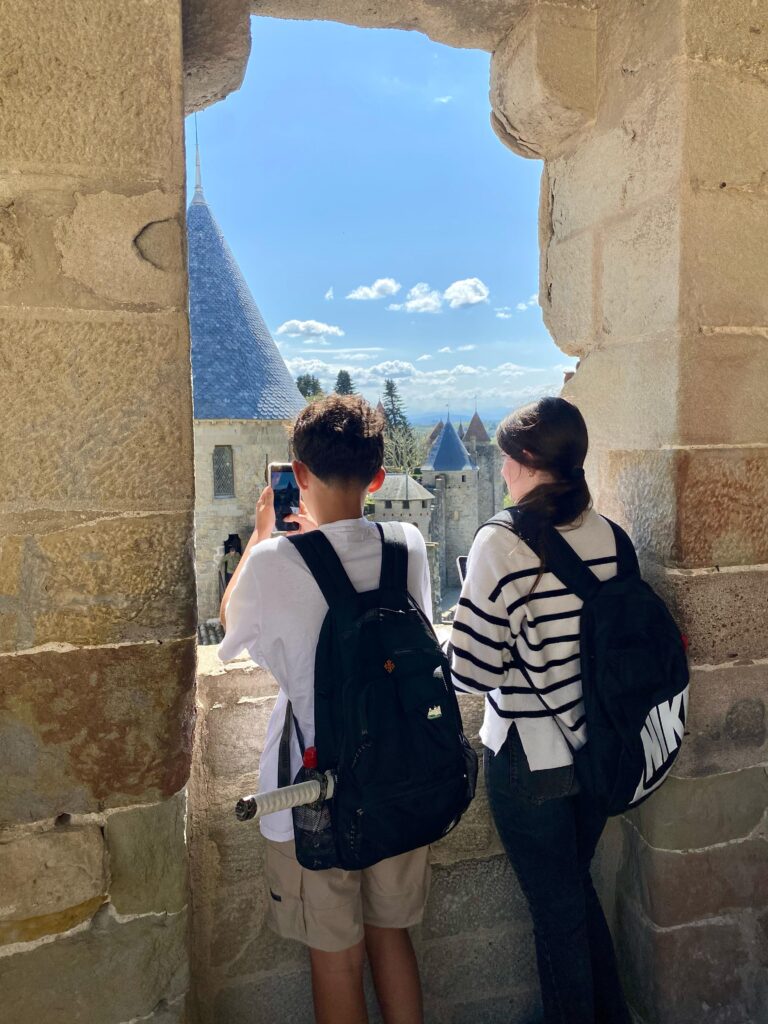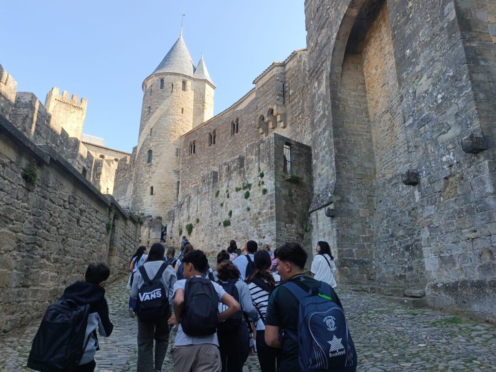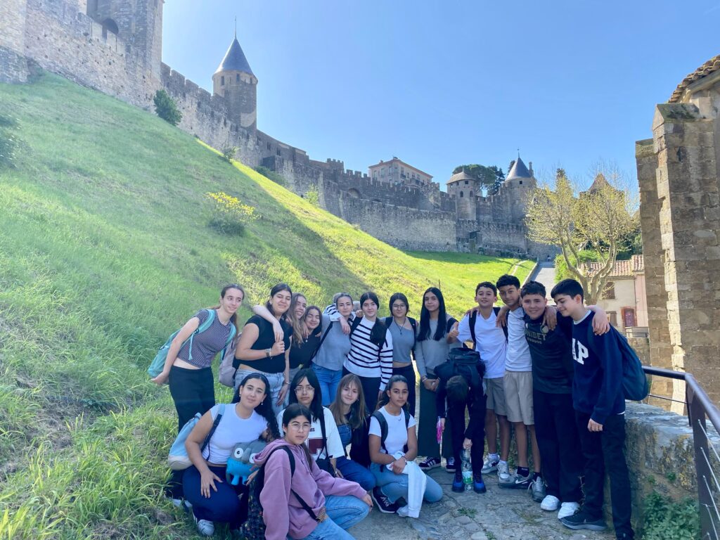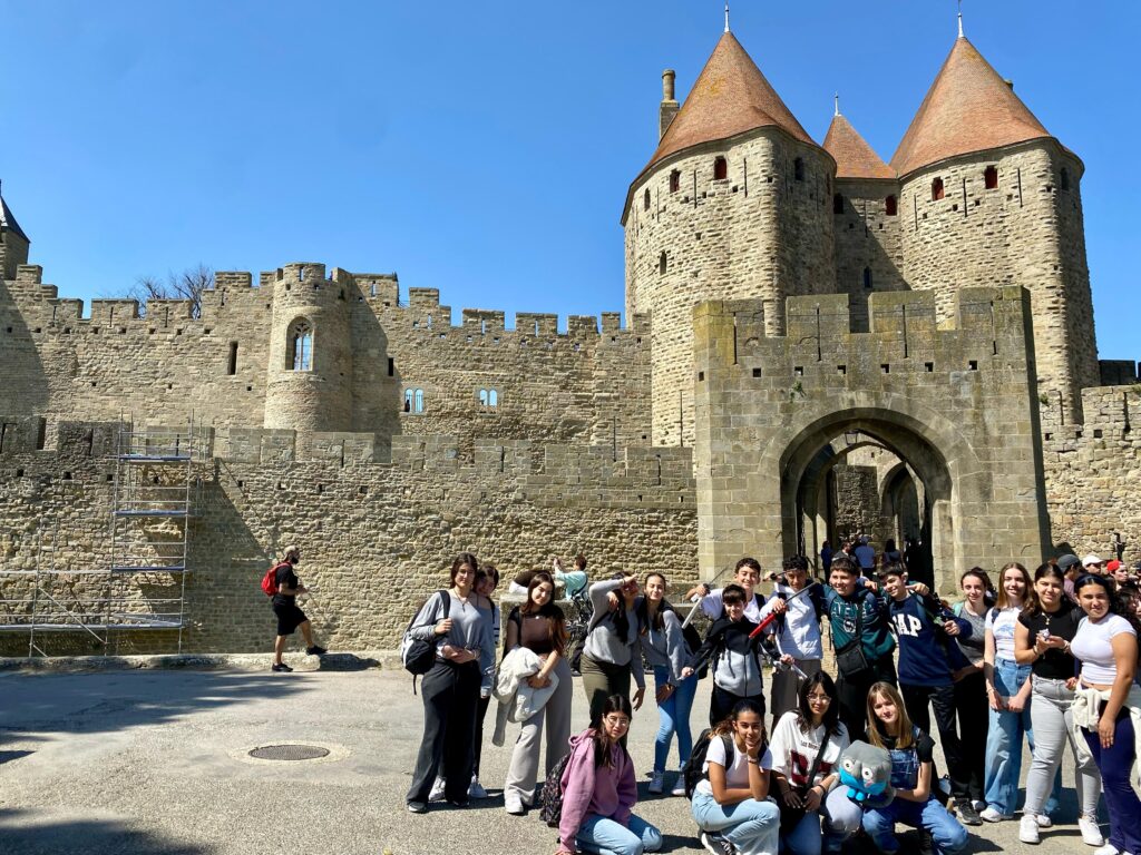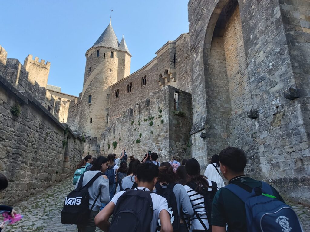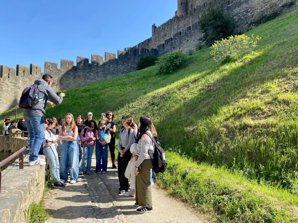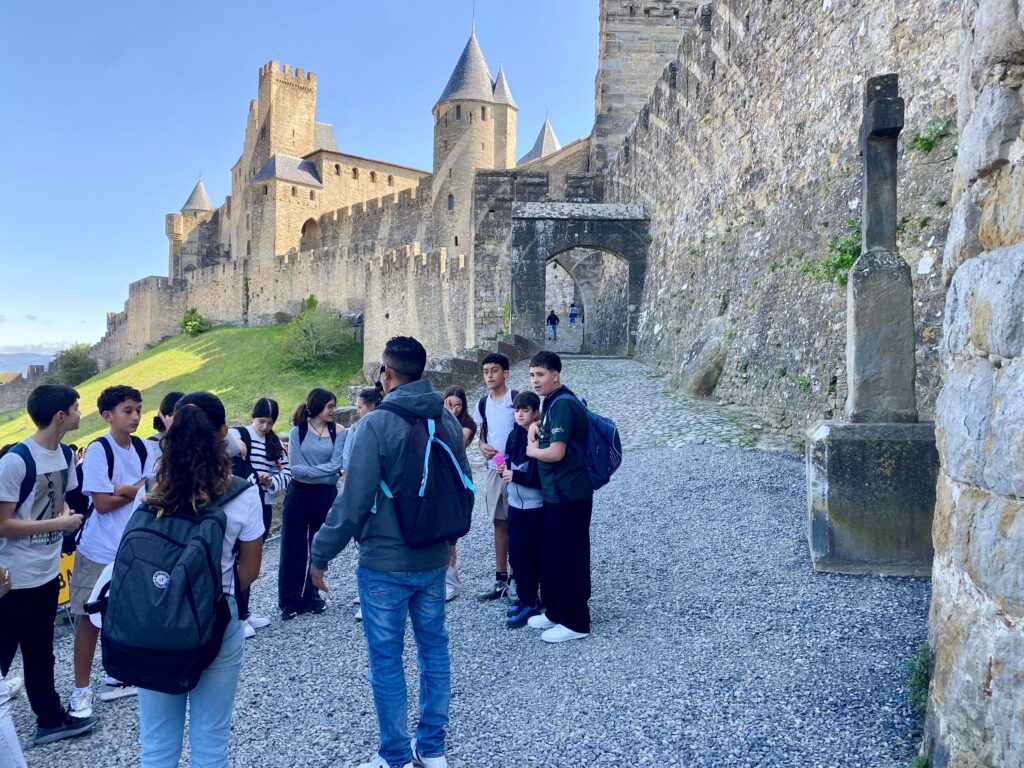 Hoy tocaba madrugar un poquito para pasar el día en la maravillosa ciudad fortificada de Carcassonne, patrimonio mundial de la humanidad por la UNESCO desde 1997 y una visita obligatoria dentro de nuestro itinerario. Cogimos la guagua dirección a la ciudad francesa , una vez allí nuestro guía nos explicó algunas curiosidades de lugar, visitamos la iglesia Saint-Nazaire, paseamos , algunos entramos en la casa del miedo y disfrutamos del soleado día. Después recorrimos juntos el castillo, un último paseo, un combate de los chicos ( que lo cuenten ellos) y de regreso a Montpellier.